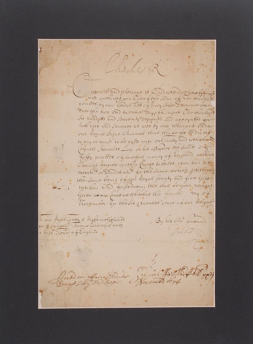 Manuscript DS, signed “Charles R,” one page, 8.5 x 13, November 4, 1674. Order for a payment of “the sum of fifty pounds of lawfull money of England” to a colonel. Signed across the top by King Charles and countersigned at the conclusion by Thomas Osborne, Lord Danby. Matted to an overall size of 12.5 x 17. In very good condition, with moderate foxing, dampstaining and chipping to edges, and a repaired tear to the lower right. Accompanied by a color copy of a letter of authenticity from PSA/DNA.