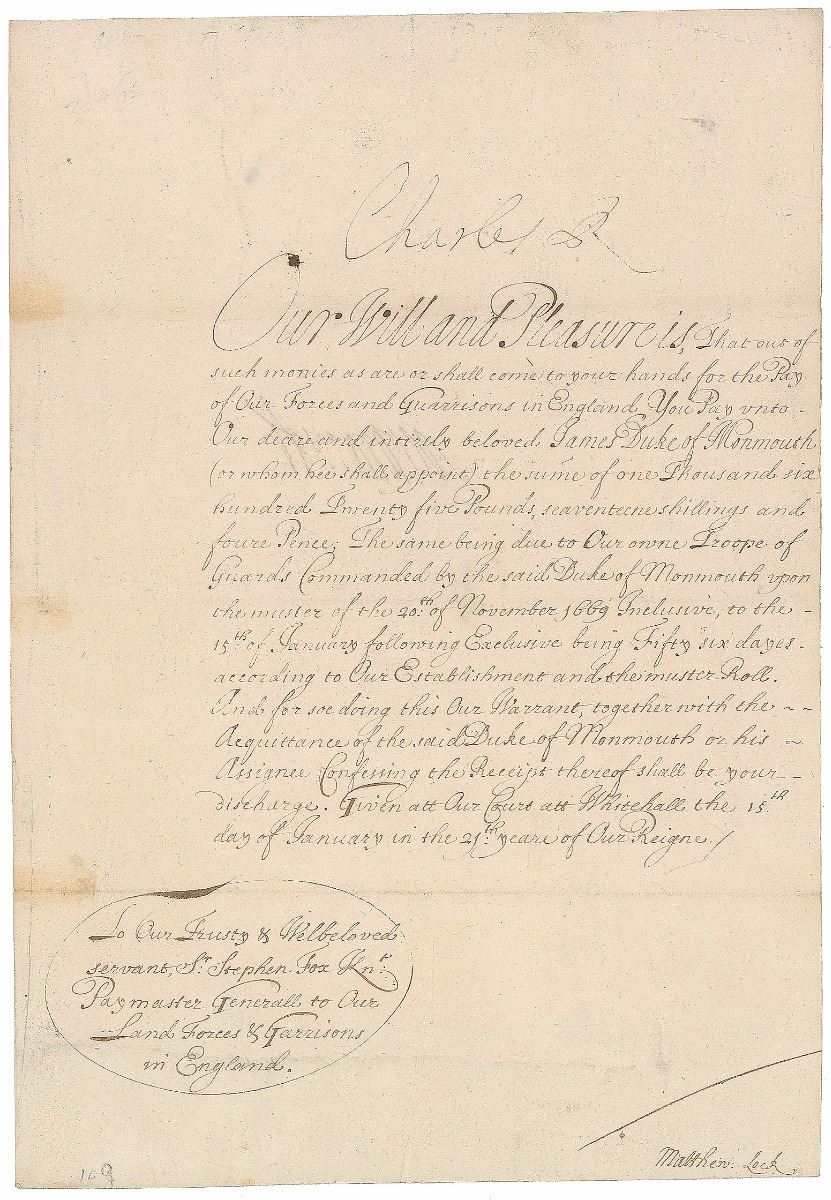 British monarch (1630–1685) who ushered in the Restoration of 1660 and ruled until his death. Uncommon manuscript DS, signed “Charles R,” one page, 8 x 11.75, January 15, 1670. King Charles orders a payment to James, Duke of Monmouth, of “one Thousand six hundred Twenty five Pounds, seaventeene shillings and foure Pence, the same being due to Our owne Troope of Guards Commanded by the said Duke of Monmouth upon the muster of the 20th of November 1669.” Signed at the top by King Charles II and on the reverse by Monmouth. In fine condition, with professional repairs and cleaning. The eldest illegitimate son of Charles II, Monmouth famously led the unsuccessful 1685 revolt against his uncle, King James II, by which he attempted to claim the throne for himself; his failure resulted in his beheading shortly thereafter. Items signed by both Charles II and Monmouth are exceptionally rare.