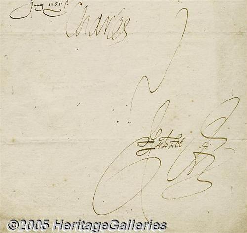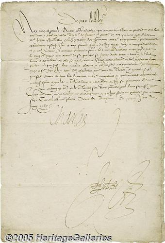 <B>King Charles IX of France Manuscript Letter Signed</B></I> "Charles" in French as King of France, one page , 8.5" x 12.5". Bayonne, June 22, 1565. Partially translated. The 15-year-old King writes to several counselors, in part: "Having been advised of something troubling or seeming to trouble our beloved and faithful counselor, the Treasurer of France and general of our finances in the Piedmont, Monseigneur Jean Chastellier, in the enjoyment of his honors... which he has as for a long time made in behalf of out predecessors and of us... and also wishing to put under consideration the rank and degree which, due to his title, his wife ought to have... we have thought of you in writing the present letter and by it command, order and expressly to enjoin you... to confirm... the said Chastellier... and his said wife in all the honors... appertaining to his said title and office." During his minority, the kingdom was ruled by his mother, Catherine de Medicis. King Charles IX was completely under her domination from 1563 until his death at the age of 24 in 1574. Folds touch signature, 0.25" separation at upper edge. Lightly foxed. Creased. Erased pencil notes (unknown hand) not touching text. Worn, fragile edges. <I>Accompanied by COA from PSA/DNA.</B></I>