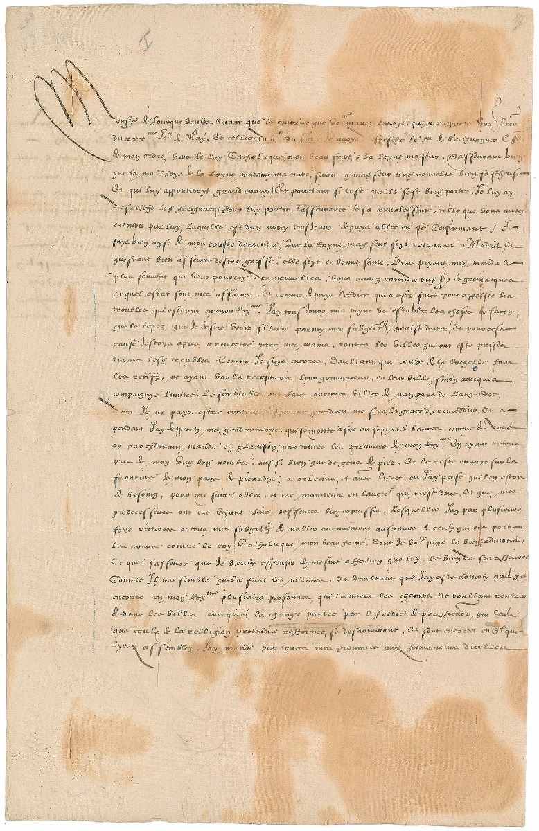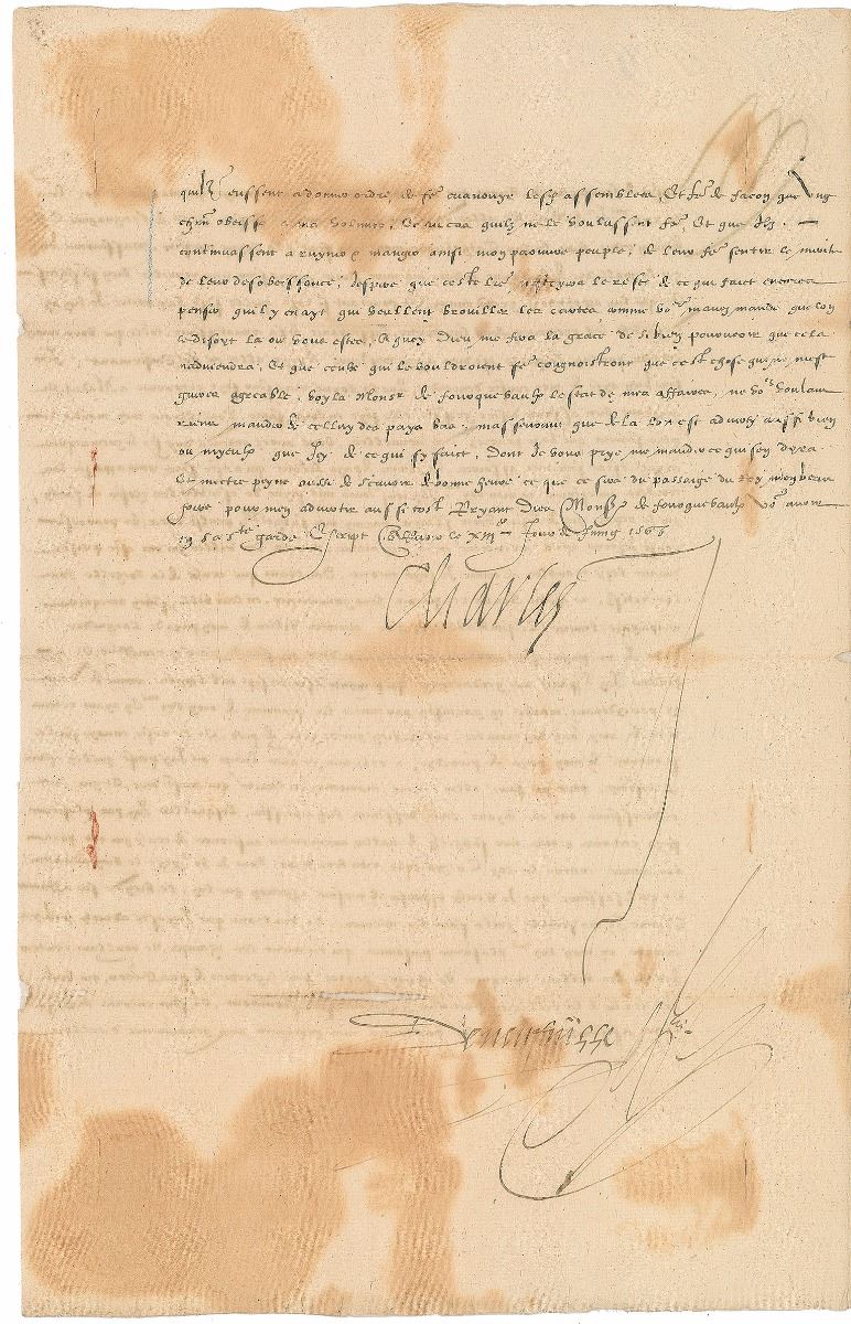 The king’s commentary on his family at the beginning of the letter clearly shows the interconnectedness of 16th century Europe; unfortunately his sister, Elisabeth of Valois, would die during childbirth in October. He goes on to discuss the Edict of Longjumeau, a peace treaty which officially ended the second phase of the French Wars of Religion and granted significant religious privileges and freedoms to the Huguenots. The peace lasted only six months before war broke out again, and the conflict would continue for much of the rest of the century.