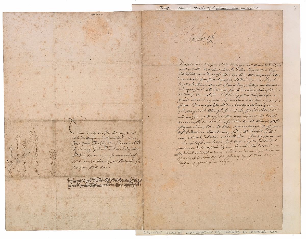 King of England, Scotland, and Ireland (born 1600) from 1625 until his execution in the wake of the English Civil War in 1649. LS signed “Charles R,” one page, 7.5 x 11.5, November 15, 1628. Letter to Lord Viscount Falkland. In part: “We have understood that Thomas Mall, esquire, hath of late married a wide there, by whom there are many debts due unto him from several persons, the recovery whereof, by a legal and ordinary course of proceeding, would prove tedious and expensive…We are pleased, and do hereby authorize and require that you call before you such as are so indebted to him, and take such as course as they may answer the debts that are justly due unto him, with as little possible trouble, charge, and loss of time as may be.” Retains the address panel on the second adjoining sheet. Affixed to a slightly larger scrapbook page. In very good condition, with intersecting folds and overall foxing and soiling. The full text of this document can be found in the 1863 book Calendar of the Patent and Close Rolls of Chancery in Ireland, of the Reign of Charles the First. An uncommon document from early in Charles’s reign.