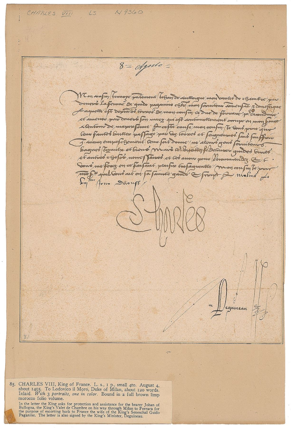 Monarch of the House of Valois (1470–1498) who ruled as King of France from 1483 to his death in 1498. Rare LS in French, signed “Charles,” one page, 7.75 x 8.25, August 4, [circa 1495]. Letter to Lodovico il Moro, Duke of Milan, asking for protection and assistance for the bearer, Johan of Bullogna, the king's valet, on his way through Milan to Ferrara for the purpose of escorting back to France the wife of the king's seneschal, Guido Paganinio. Prominently signed at the conclusion by King Charles VIII, and countersigned by the king's minister, Deguineau. Professionally inlaid into a larger sheet, which bears an affixed description below. In very good to fine condition, with light staining and creasing.