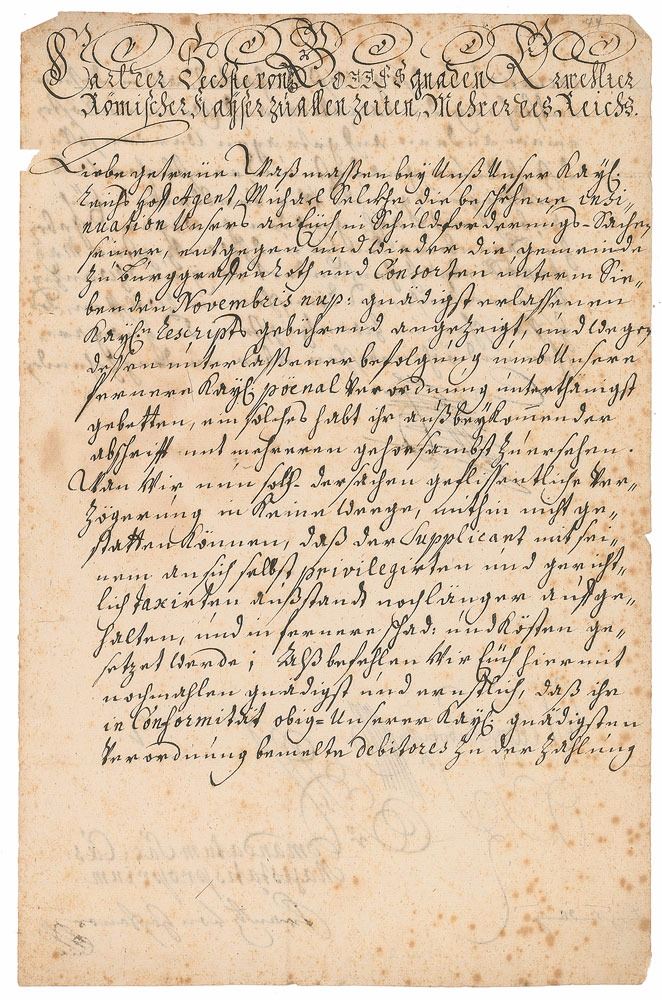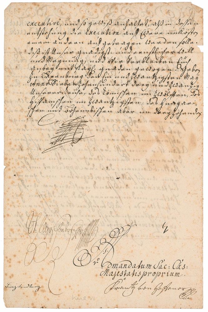 Holy Roman Emperor, King of Bohemia, King of Hungary and Croatia, Serbia and Archduke of Austria, (born 1685) who served from 1711 until his death in 1740, which ultimately led to the War of the Austrian Succession. Untranslated manuscript DS in German, one page both sides, 8.5 x 13, no date. Signed at the conclusion by the king. In very good condition, with light toning and foxing.