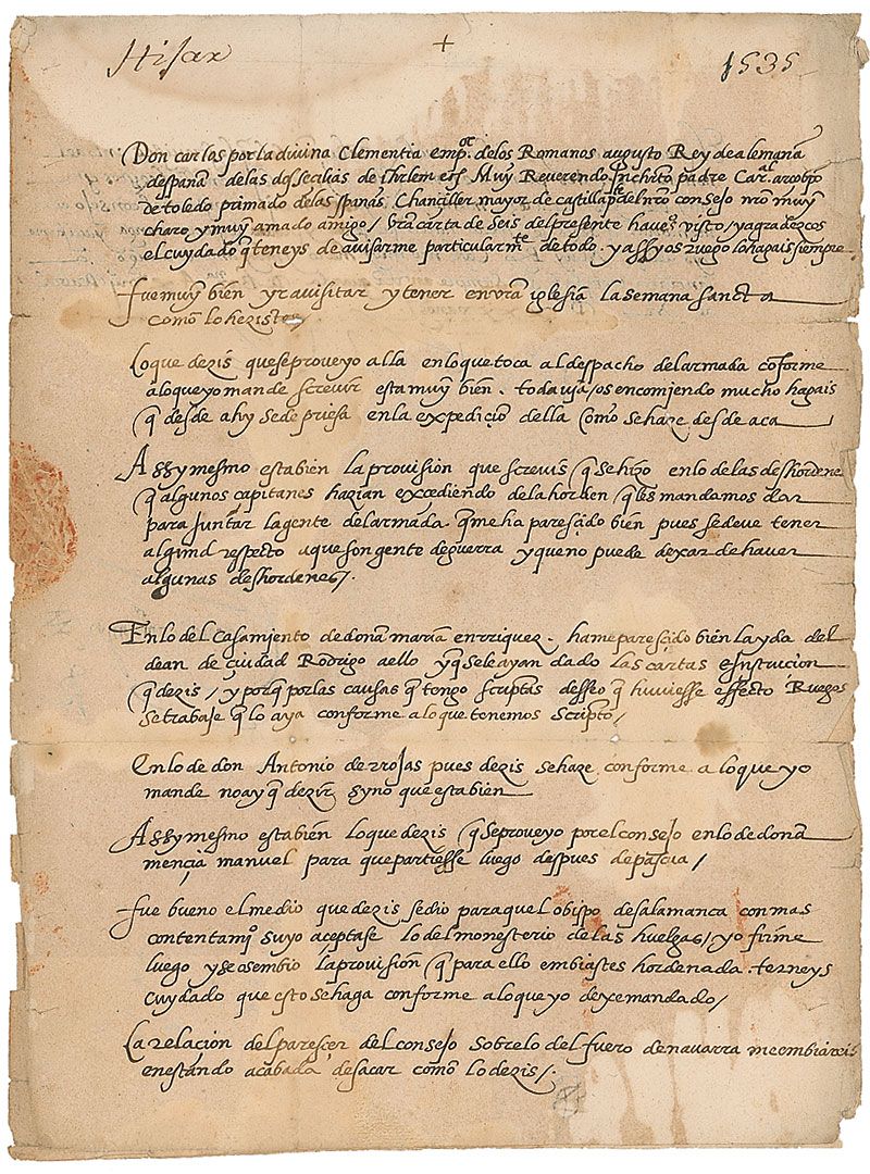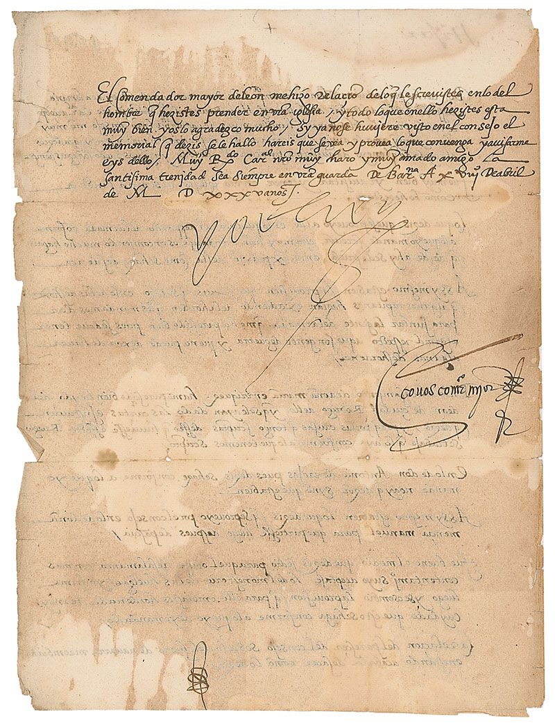 LS in Spanish, signed “Yo el Rey,” one page both sides, 9 x 12, 1535. Letter to the Cardinal Archbishop of Toledo, Alonso da Fonseca, signed “Yo el Rey” (I the King) and countersigned by the Comendador Mayor Francisco de los Cobos. A lengthy letter communicating various decisions on matters submitted by the Archbishop on people he had detained, and the disorders of certain captains, in part (translated): "It is important to maintain respect for our warriors, even if we have to accept some disorders." In very good condition, with intersecting folds passing through a portion of the signature, small separations and holes along folds, and moderate scattered staining, which does not affect the legibility, only the overall appearance.