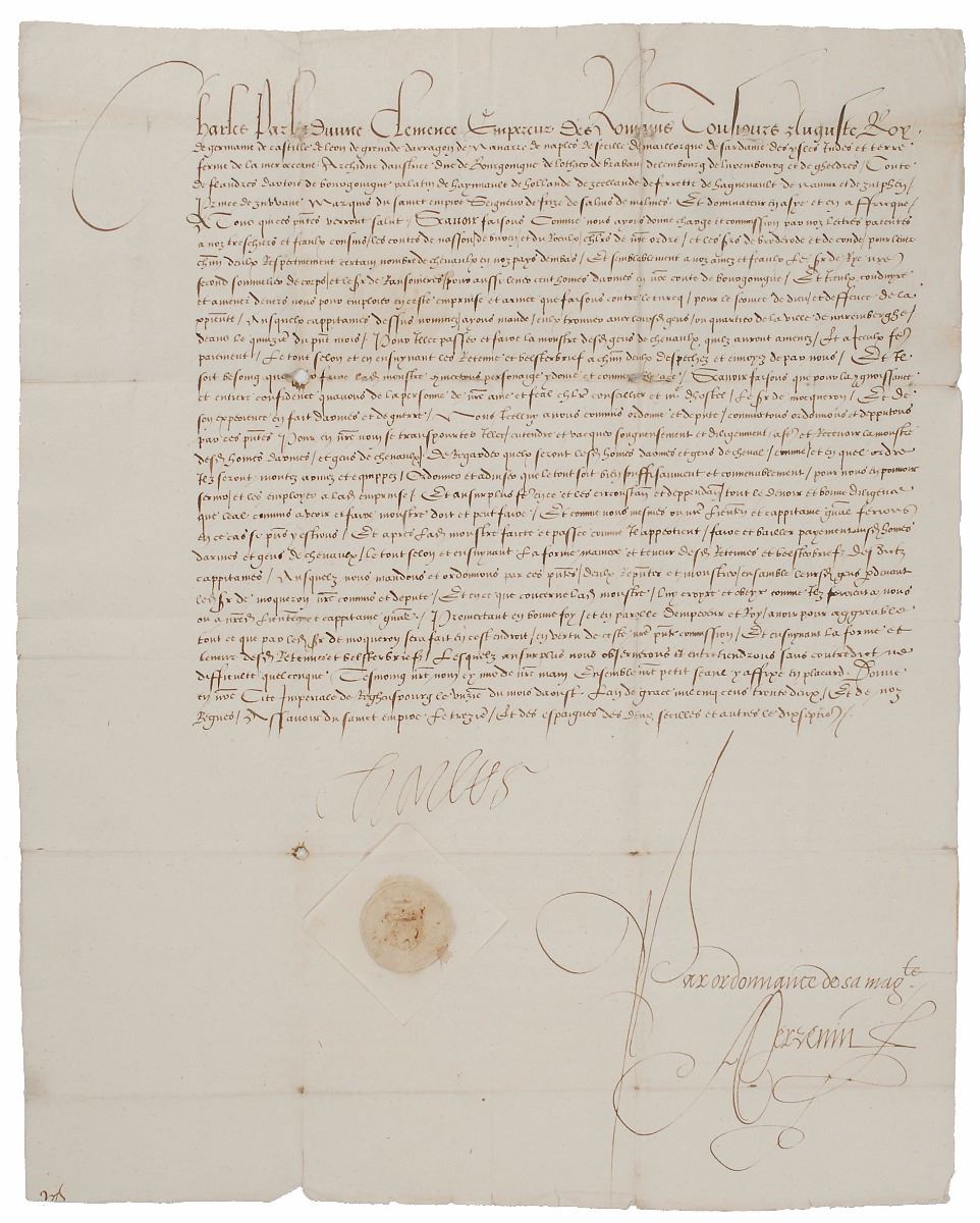 Holy Roman Emperor who, as Charles I, also served as king of Spain (1500–1558). Manuscript DS, signed “Charles,” one page, 16.5 x 20.75, August 11, 1532. Untranslated imperial act. Upon learning that the Ottoman ruler Suleiman the Magnificent has invaded Hungary with 300,000 soldiers, Charles orders his lieutenants, all Knights of the Golden Fleece, to raise troops and horses “and ride these to Nuremberg to be used in the army against the Turk for the service to God and the Defence of Christianity.” At Nuremberg the men and horses must be reviewed and inspected by the Lord Mocqueron to ensure the army is sufficiently prepared. Crisply signed at the conclusion by the king and countersigned by Cerzenin. The beautifully embossed paper seal affixed at the bottom remains fully intact. A few repaired edge separations to intersecting folds, noticeable paper loss at fold intersections, and mild soiling, otherwise fine condition; especially bright and clean for its age. An attractive 16th–century document with excellent military content.