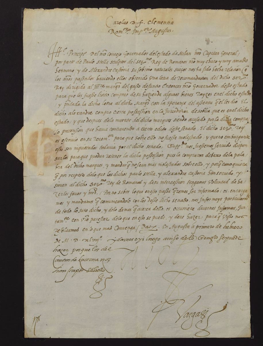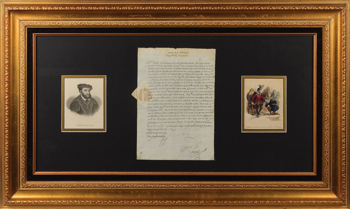 Holy Roman Emperor who, as Charles I, also served as king of Spain (1500–1558). LS in Spanish, signed “Carol,” one page, 8.25 x 12, February 1, 1548. Letter to the Captain-General of Milan, in which Charles intercedes on behalf of Paulo Stolla, Sculptor to the Sixth King of the Romans, and his nephew Alexander Castoria, both Swiss, concerning a real estate dispute. Nicely mounted, matted, and framed with two engravings to an overall size of 37 x 22. In fine condition. A remarkably well-preserved document featuring interesting content.