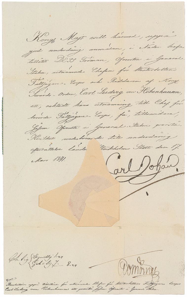 King of Sweden and Norway from 1818 to 1844; born Jean-Baptiste Bernadotte, he was appointed as a Marshal of France by Napoleon after a long military career before becoming king (1763–1844). Manuscript DS in Swedish, signed “Carl Johan,” one page, 8 x 14, March 27, 1841. Untranslated document awarding the Order of the Sword. The white paper seal affixed at the bottom remains fully intact. In fine condition, with two small tears along top edge.