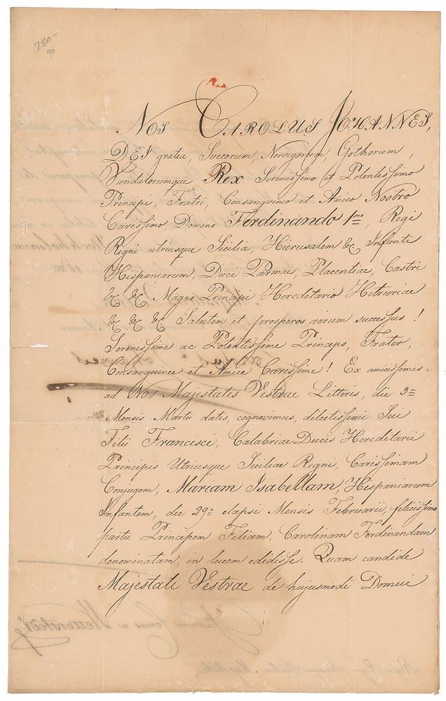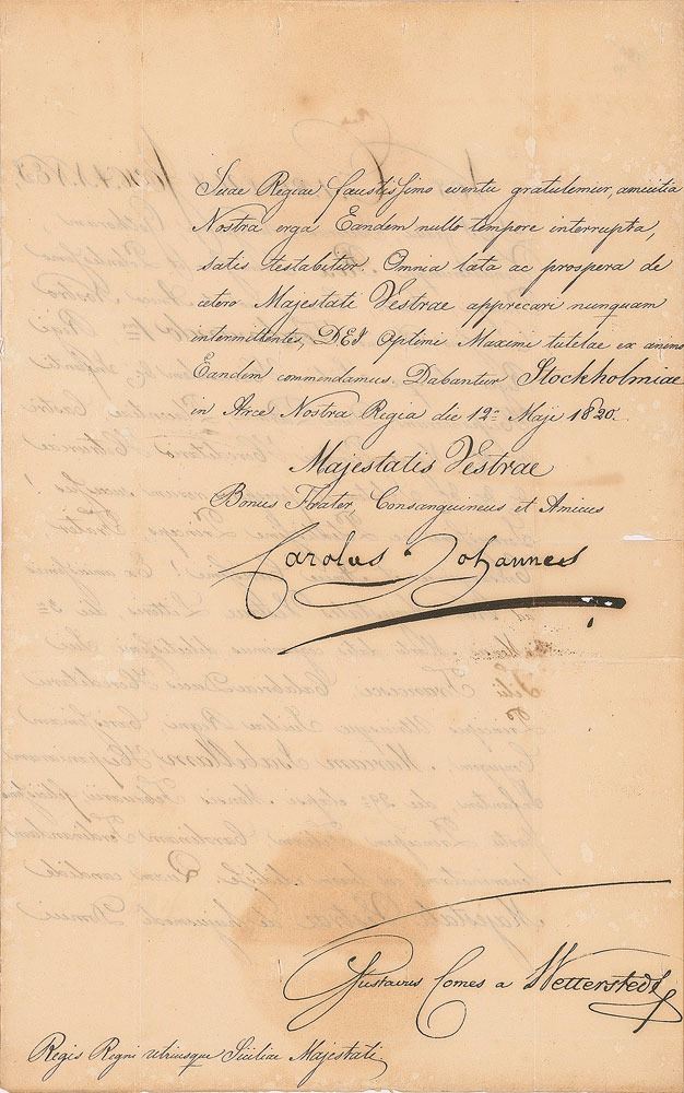 King of Sweden and Norway from 1818 to 1844; born Jean-Baptiste Bernadotte, he was appointed as a Marshal of France by Napoleon after a long military career before becoming king (1763-1844). Untranslated manuscript DS in Latin, signed “Carolus Johannes,” one page both sides, 8.75 x 14.25, May 12, 1802. In very good condition, with a tear to the left edge, intersecting folds, and light staining.