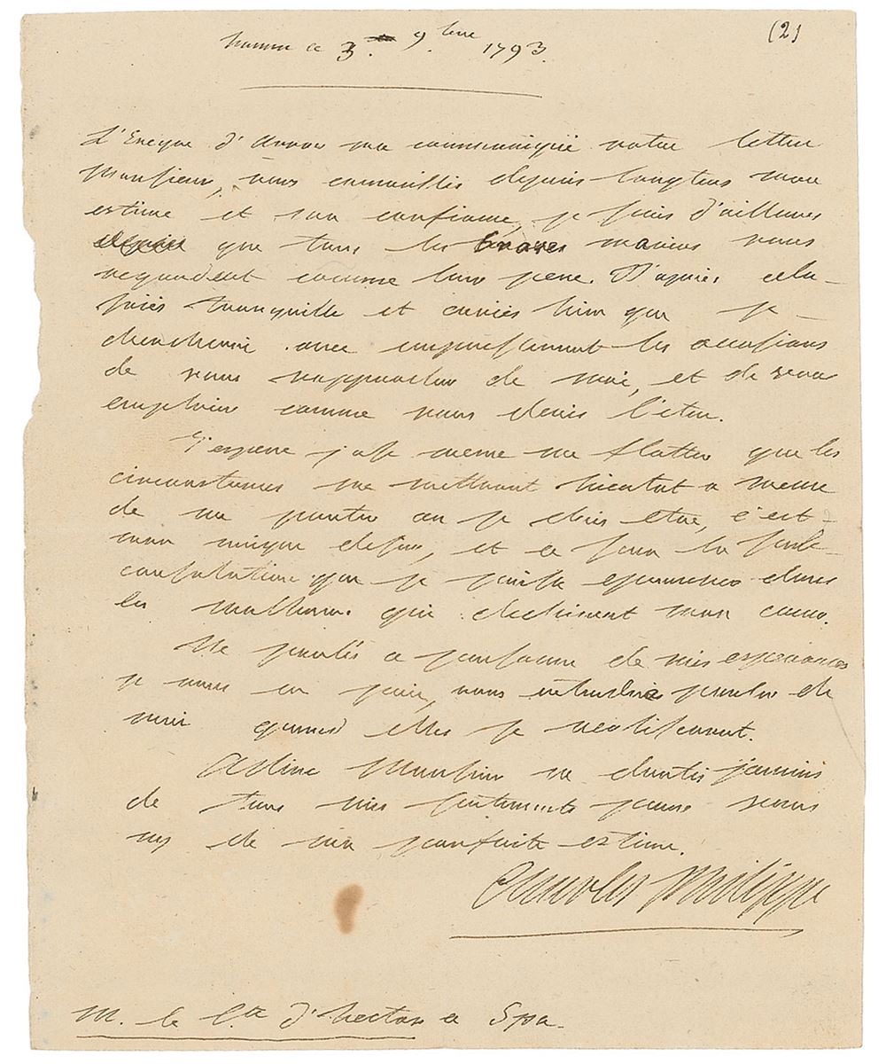 King of France from 1824 to 1830 whose attempt to restore absolute rule led to his overthrow in the July Revolution. ALS in French, signed “Charles Philippe,” one page, 6 x 7.25, November 3, 1793. Letter to Count Charles-Jean d’Hector, coordinator of French naval forces during the American revolution. In full (translated): “The Bishop of Antwerp has sent me your letter Monsieur. You have long deserved my esteem and trust. Further, I know that all their brave sailors consider you their father. Therefore be assured and convinced that I will assiduously look for opportunities to bring you closer to me and employ you as you deserve to be. I hope, even dare to expect that circumstances soon put me in a position to establish myself where I ought to be, that is my only desire, and it will be my only consolation for suffering the pain I endure, which is tearing my heart apart. Speak to no one of my hopes, I beg you; when they have been realized you will hear about them from me. Adieu, Monsieur, never doubt my feelings for you and of my perfect esteem.” Central horizontal and vertical fold, a trivial spot next to signature, and a bit of mild toning, otherwise fine condition. Future kings Louis XVIII and Charles X named d'Hector head of the French Navy in 1792. A failed invasion attempt took place at Quiberon, July 21, 1793.