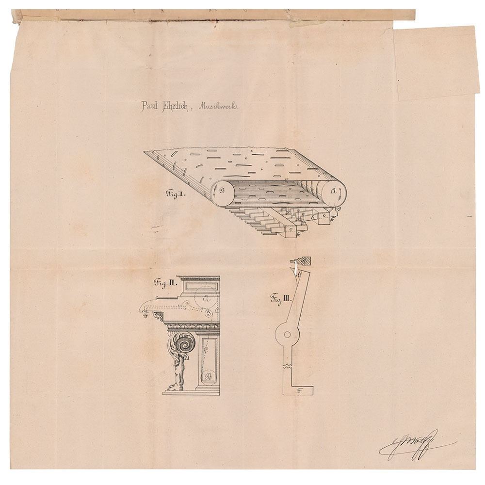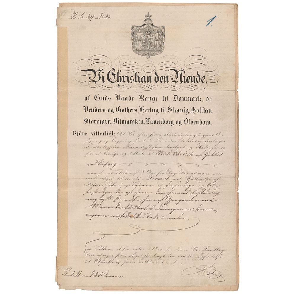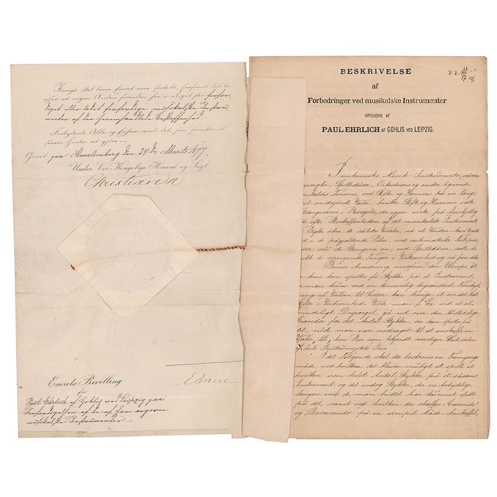 Partly-printed DS in Danish, signed “Christian R,†one page both sides, 9 x 14.5, March 24, 1877. Patent document issued to Paul Ehrlich for "improvements in musical instruments," signed at the conclusion by King Christian IX. Retains the original seal, and the attached four-page description of the invention. Also attached is a fold-out diagram of the invention, evidently a mechanism for player pianos or other musical automata. In very good to fine condition, with overall creasing, intersecting folds, and old paper tape along the hinge.