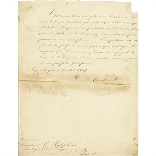 <B>King Christian IX of Denmark Autograph Letter Signed</B></I> "Christian IX". One page, in French, 8.5" x 11.25". Copenhagen Denmark , July 1, 1847, to Monsignor G. Halphen Consul General Paris. When Frederick VII died in 1863, Christian (1818-1906) took the throne as Christian IX. He reigned as King of Denmark from November 1863 to January 1906. He was immediately plunged into a crisis over the possession and status of Schleswig and Holstein, two provinces to Denmark's south when, under pressure, he signed the November Constitution, a treaty that made Schleswig part of Denmark. This resulted in a brief war between Denmark and a Prussian/Austrian alliance in 1864. This Second War of Schleswig's outcome was unfavorable to Denmark and led to the incorporation of Schleswig into Prussia in 1865. Holstein was likewise incorporated into Prussia in 1865, following further battle between Austria and Prussia. Very good condition, with small tear in the upper right corner, tape on verso, and toning.<BR><BR><b>Shipping:</b> Flat Material, Small (<a target="_blank" href="http://www.heritageauctions.com/common/shipping.php">view shipping information</a>)