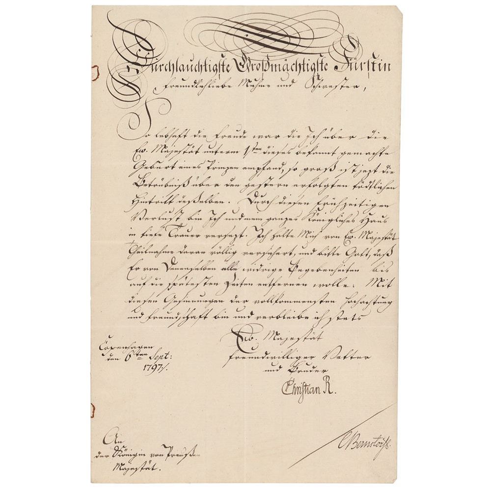 LS in Danish, signed “Christian R,†one page, 8 x 12.5, September 6, 1797. Untranslated official letter. In fine condition.