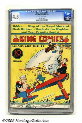 <B>King Comics #10 (David McKay Publications, 1937) CGC VG+ 4.5 Cream to off-white pages.</B></I> This is the only copy that CGC has certified to date of this Platinum Age issue, a Gerber "7." While the cover offered yet another Popeye and Henry team-up, there was also adventure fare inside, with King Features stalwarts Flash Gordon and Mandrake the Magician both appearing. Overstreet 2005 VG 4.0 value = $180. CGC census 4/05: 1 in 4.5, none higher.