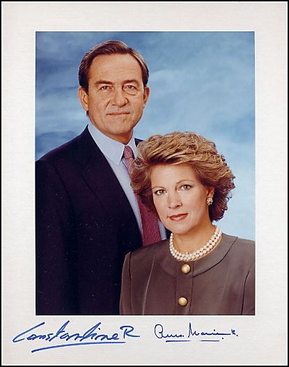 King and Queen of Greece from 1864 to 1973. Color semi-glossy 6 x 7.75 portrait of the royal couple, affixed to the original 8 x 10 studio mount, signed on the mount in blue felt tip, “Constantine R” and “Anne Marie R.” Reverse bears a Lichfield Studio label. In fine condition.