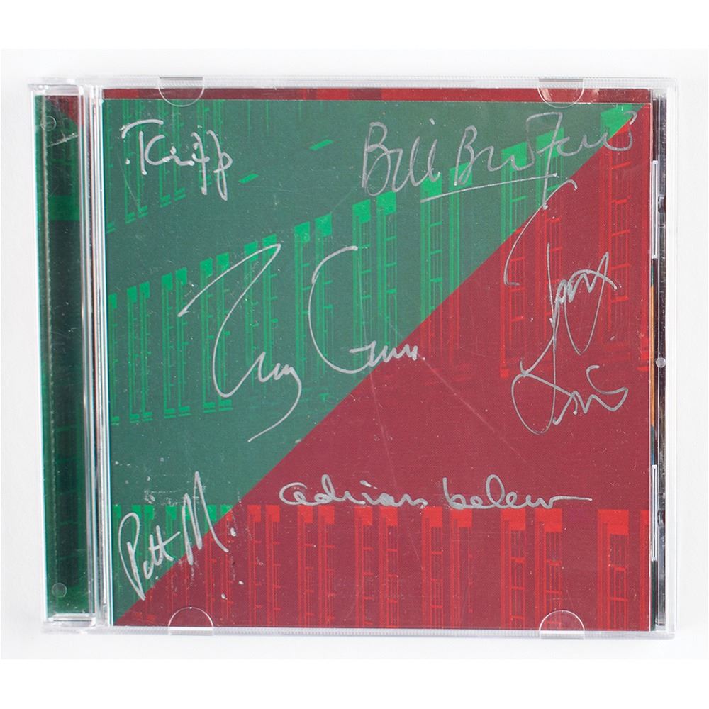 Vrooom CD by King Crimson, signed on the front cover in silver ink by Robert Fripp, Adrian Belew, Tony Levin, Trey Gunn, Bill Bruford, and Pat Mastelotto. In fine condition. The CD is included. Accompanied by a ticket stub for a King Crimson concert held at the Paramount Theatre in Seattle, Washington, on June 22, 1995.