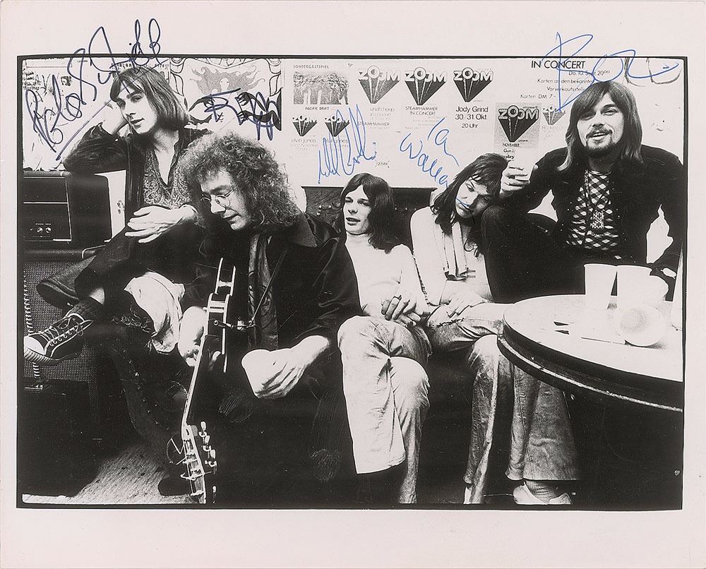 Semi-glossy 10 x 8 photo of King Crimson circa 1971, signed in black felt tip by Robert Fripp and Peter Sinfield, and in blue ballpoint by Ian Wallace, Mel Collins, and Boz Burrell. In fine condition, with scattered light creasing, and rippling to the left edge.