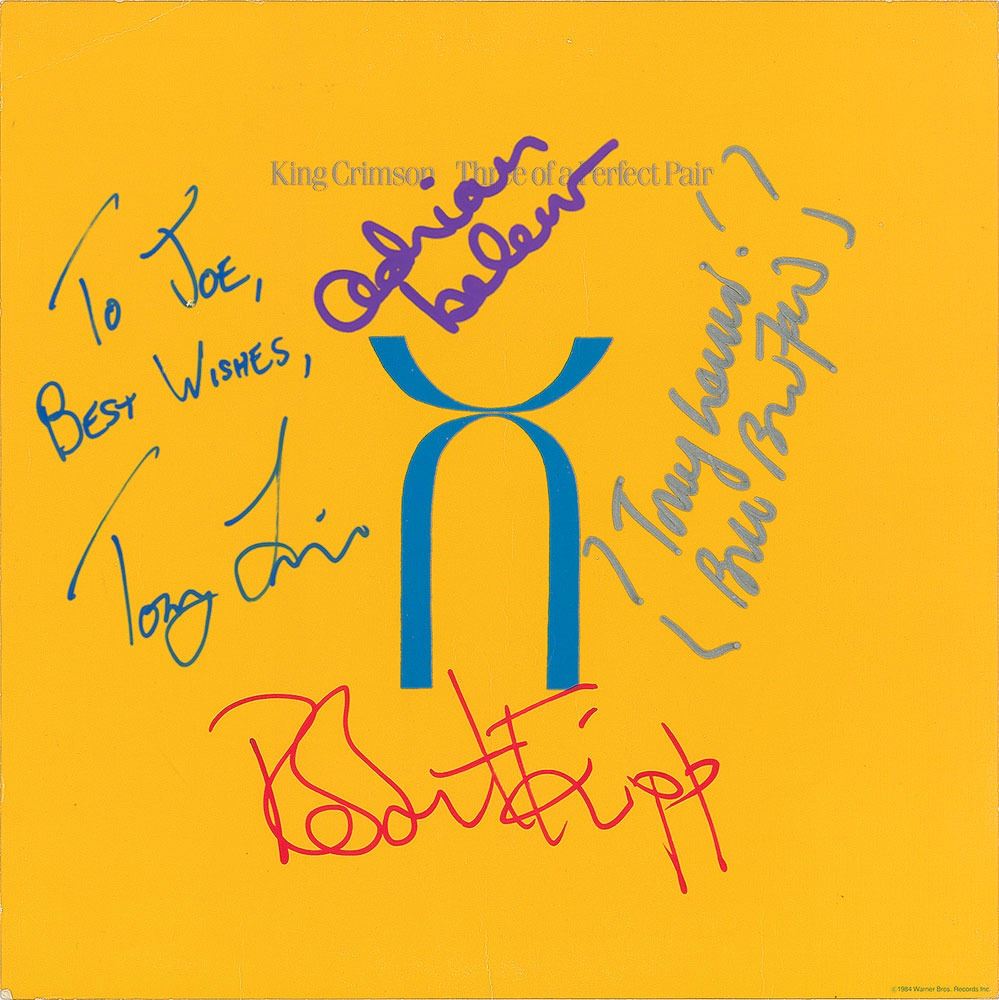 Three of a Perfect Pair album flat signed and inscribed on the front in various colored paint pen, "Robert Fripp," "Adrian Belew," "To Joe, Best Wishes, Tony Levin," and "Bill Bruford," who playfully adds Levin's name above. In fine condition. The record is not included. Consignor notes that the signatures were obtained in person.