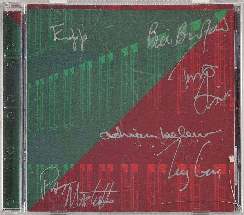 Vrooom CD insert signed on the front in silver ink by Robert Fripp, Adrian Belew, Tony Levin, Trey Gunn, Bill Bruford, and Pat Mastelotto. In fine condition. The CD is included.