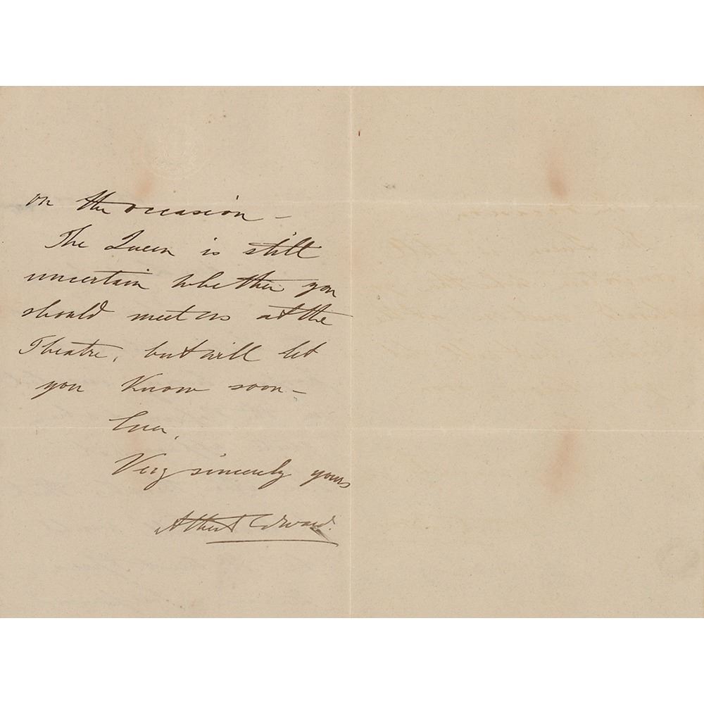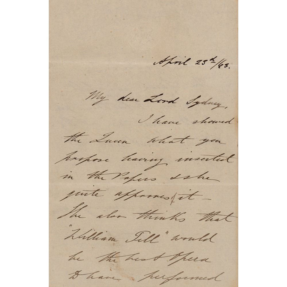 ALS signed “Albert Edward,” one page, 4.75 x 7, embossed Windsor Castle letterhead, April 23, 1865. Handwritten letter to Lord Sydney, communicating information on behalf of his mother, Queen Victoria. In part: "I have showed the Queen what you propose having inserted in the Papers & she quite approves of it—She also thinks that 'William Tell' would be the best opera to have performed on the occasion." In fine condition.