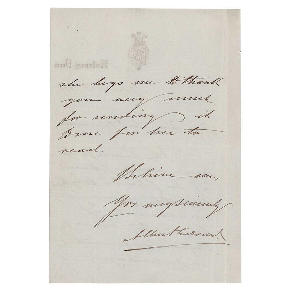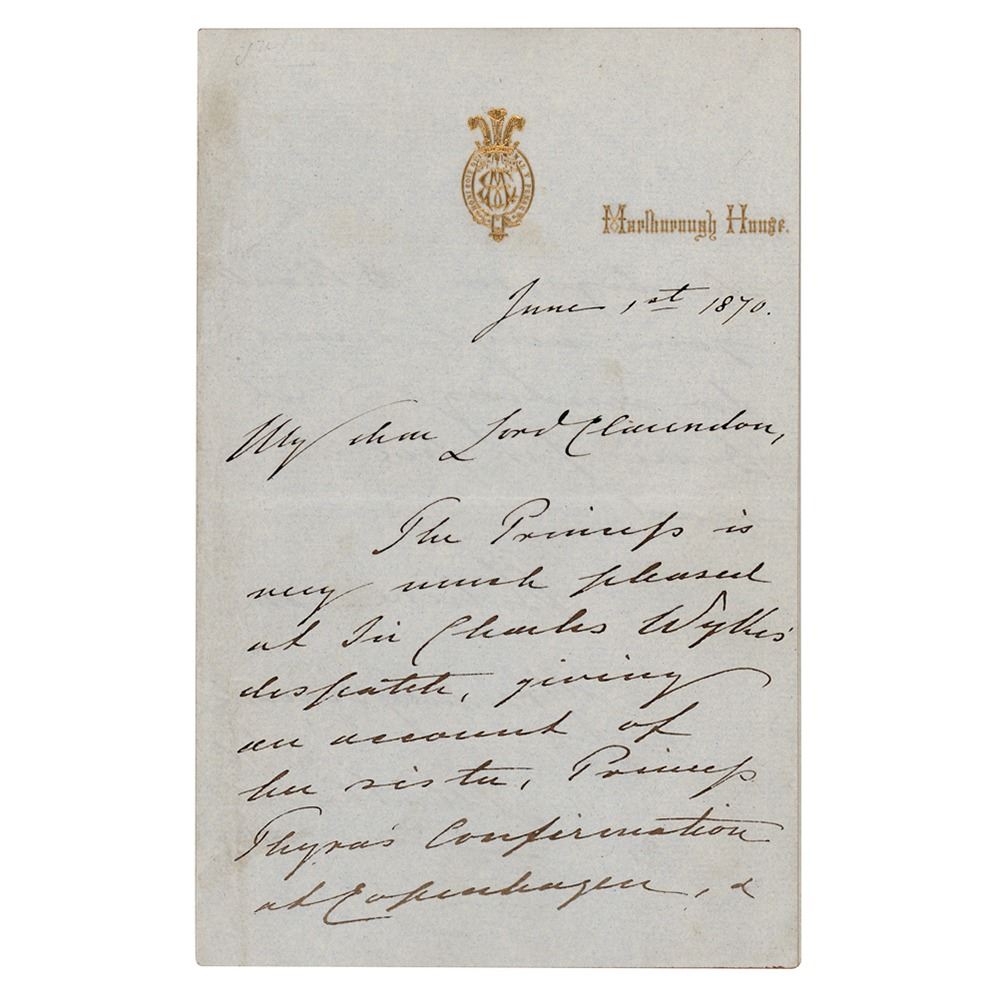ALS signed “Albert Edward,†one page both sides, 4.5 x 7, gilt-embossed Marlborough House letterhead, June 1, 1870. Handwritten letter to Lord Clarendon, in full: "The Princess is very much pleased at Sir Charles Wyke's dispatch, giving an account of her sister, Princess Thyra's confirmation at Copenhagen, & she begs me to thank you very much for sending it to me for her to read." In fine condition.