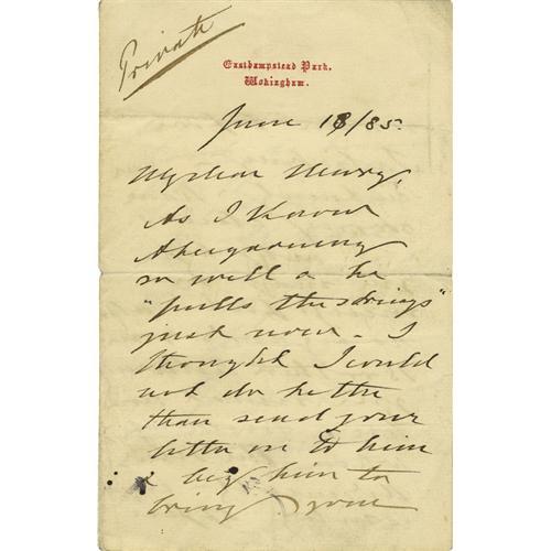 <B>King Edward VII of England Autograph Letter Signed</B></I> "<I>Albert Edward</B></I>". Three pages, 4.5" x 7", Easthampstead Park letterhead, Wokingham, June 18, 1885. An interesting letter, written as Prince of Wales (a title he held longer than anyone else, 1841-1901), in part: "<I>Private. My dear henry, As I know Abergaruing ? so well as he 'pulls the strings' just now. I thought I would not do better than send your letter on to him & beg him to bring your name before Salisbury...you must not lose a moment when the new admiralty comes into office- as this govt is bound to be of short duration you will all have 'To make hay whilst the sun shines'...</B></I>" The future king was right in his prediction; the Marquess of Salisbury of the Conservative Party became prime minister the month after this letter was written but remained in office only seven months! Very good condition; some weakness and minor separation at the folds.<BR><BR><b>Shipping:</b> Flat Material, Small (<a target="_blank" href="http://www.heritageauctions.com/common/shipping.php">view shipping information</a>)