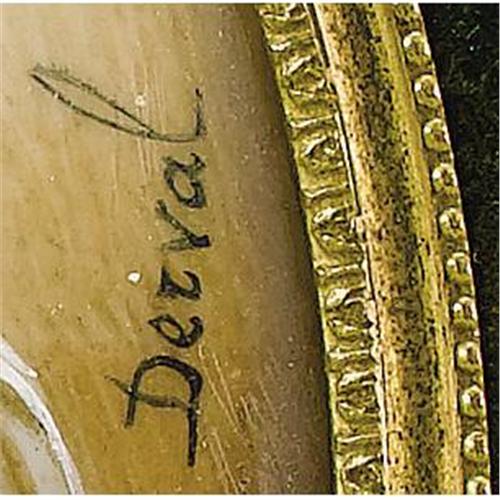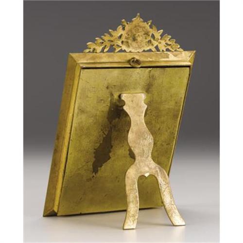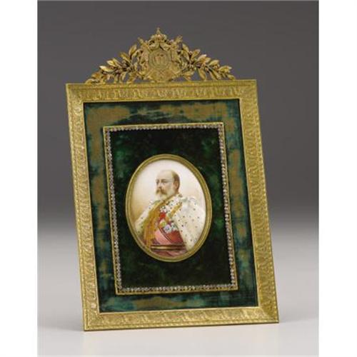 <B>King Edward VII Portrait Miniature </B></I><BR><I>Probably French, circa 1910</B></I><BR><BR>The oval miniature painted on ivory depicting Edward VII, King of Great Britain and Emperor of India (r. 1901-1910) in full court regalia wearing ermine mantle and medals, signed <I>Derval,</B></I> mounted on a green velvet backing accented with a paste border, within a gilt bronze rectangular frame with stiff-leaf border, surmounted by a heraldic crest flanked by laurel leaves-miniature-3 1/4 in. long; frame-10 x 6 1/2 in. <BR><BR><BR>Provenance:<BR>Purchased from Federico Carrera <BR><BR><b>Shipping:</b> Requires 3rd Party Shipping (<a target="_blank" href="http://www.heritageauctions.com/common/shipping.php">view shipping information</a>)