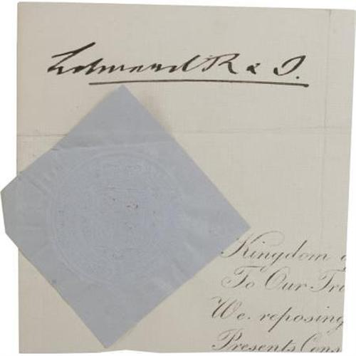 <B>King Edward VII Signature</B></I> removed from a document, 4.25" x 4.5"; signature is boldly placed above a blind embossed paper seal. Very bold and in excellent condition.<BR><BR><b>Shipping:</b> Flat Material, Small (<a target="_blank" href="http://www.heritageauctions.com/common/shipping.php">view shipping information</a>\)