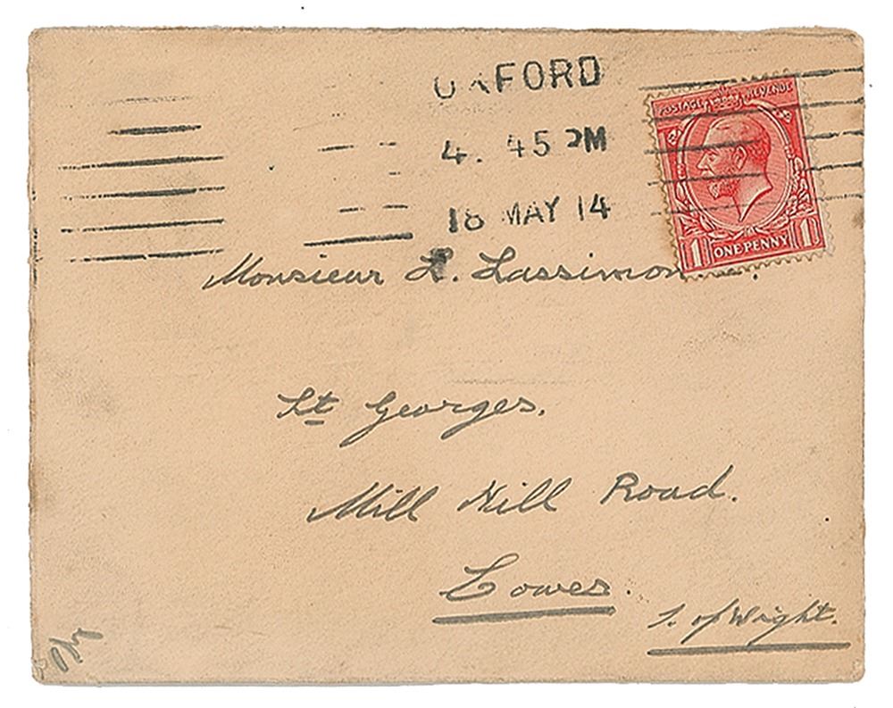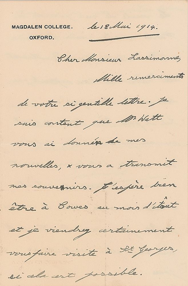 Early ALS in French, signed "Edward," three pages on two adjoining sheets, 4 x 6, Magdalen College letterhead, May 18, 1914. Handwritten letter to his former tutor Lucien Lassimonne, in full (translated): "Many thanks for your kind letter. I am pleased that Mr. Watt has given you my news and remembered me to you. I am hoping to be at Cowes in August and I will certainly come and visit you at St. Georges if that is possible. My parents visit to Paris was a great success, wasn’t it? They were delighted with the warm welcome which was shown them. Here the weather is fine and it is a real pleasure to be outside. The Osborne cadets will I am sure be interested and happy taking part in the Naval Review from 18th to 20th July. I will be in Portsmouth with my Father at that time, and then Osborne is going to be rebuilt. No more Captain’s House, no more Nelson, no more Kingston. It is a little sad, isn’t it?, but the reconstruction is necessary." In fine condition. Accompanied by the original mailing envelope, hand addressed by the Prince of Wales, who signs his initial "E" to the lower left corner; reverse bears an embossed black wax seal. Lucien Lassimonne was the French tutor to the Prince of Wales during his time at the Royal Naval College in Osborne.
