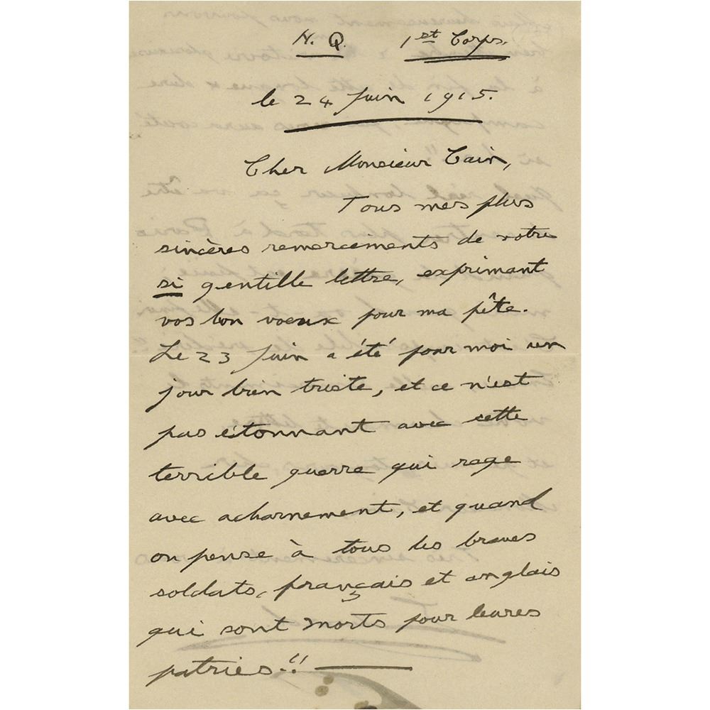 ALS in French, signed “Edward,†one page both sides, 5 x 8, June 24, 1915. Rare untranslated handwritten letter by Edward as Prince of Wales, written from the "H.Q. 1st Corps" during World War I. In fine condition.