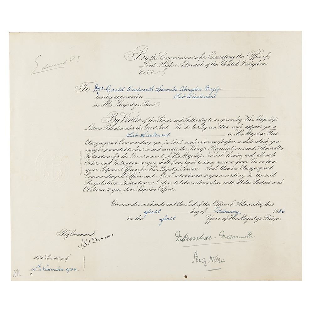Partly-printed DS signed “Edward R. I.,” one page, 14 x 12, February 1, 1936. King Edward VIII appoints Gerald Wentworth Loscombe Abingdon Bayly as "a Sub-Lieutenant in His Majesty's Fleet." Nearly signed at the head by King Edward VIII and countersigned at the conclusion by Royal Navy officers Martin Dunbar-Nasmith and Percy Noble. In fine to very fine condition. Given his brief reign—Edward VIII ruled only from January 20, 1936 until his abdication in December—documents signed in his capacity as King of the United Kingdom are scarce and highly desirable.