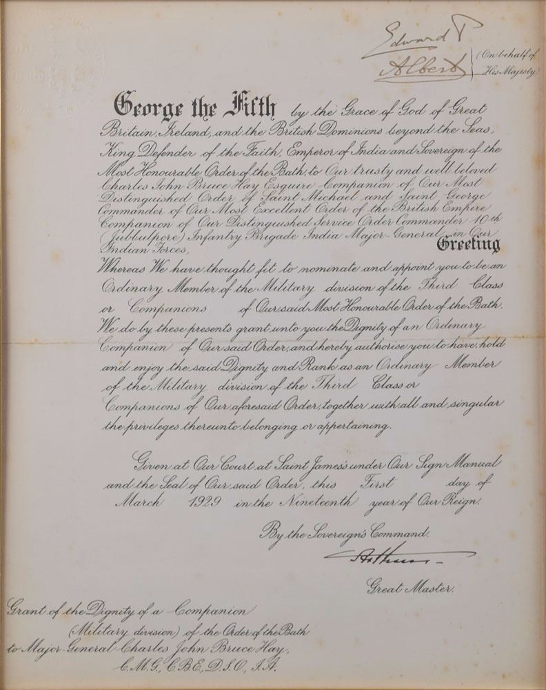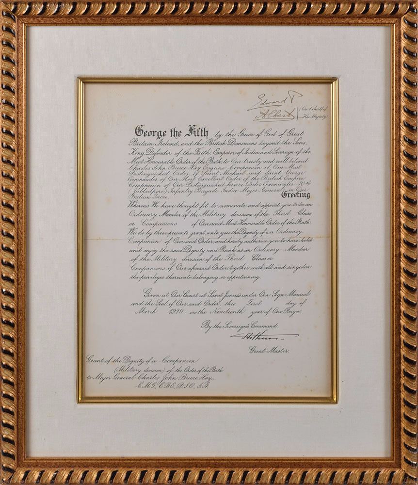 Partly-printed DS, signed “Edward P" and "Albert,” one page, 11.25 x 14.25, March 1, 1929. Appointment for Charles John Bruce Hay as an "Ordinary Member of the Military division of the Third Class or Companions of Our said Most Honorable Order of the Bath." Signed on behalf of King George V in the upper right by his two sons. Blindstamped in the upper left corner. Cloth-matted and framed to an overall size of 19 x 22. In fine condition, with scattered light foxing and a central horizontal fold. In hopes of improving his deteriorating health, King George V retired for three months to Craigweil House, Aldwick, in the seaside resort of Bognor, Sussex, arriving February 9, 1929, and leaving on May 15, 1929.