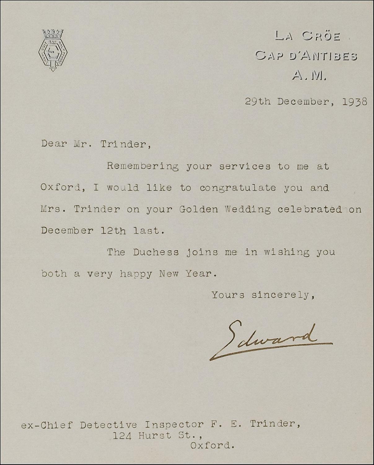 TLS signed “Edward,” one page, 6 x 7.5, La Croe Cap D’Antibes A.M. letterhead, December 29, 1938. Letter written while Duke of Windsor, to ex-Chief Detective Inspector F. E. Trinder. In full: “Remembering your services to me at Oxford, I would like to congratulate you and Mrs. Triner on your Golden Wedding celebrated on December 12th last. The Duchess joins me in wishing you both a very happy New Year.” Matted to an overall size of 8.75 x 10.5 In fine condition, with a bit of scattered mild toning.