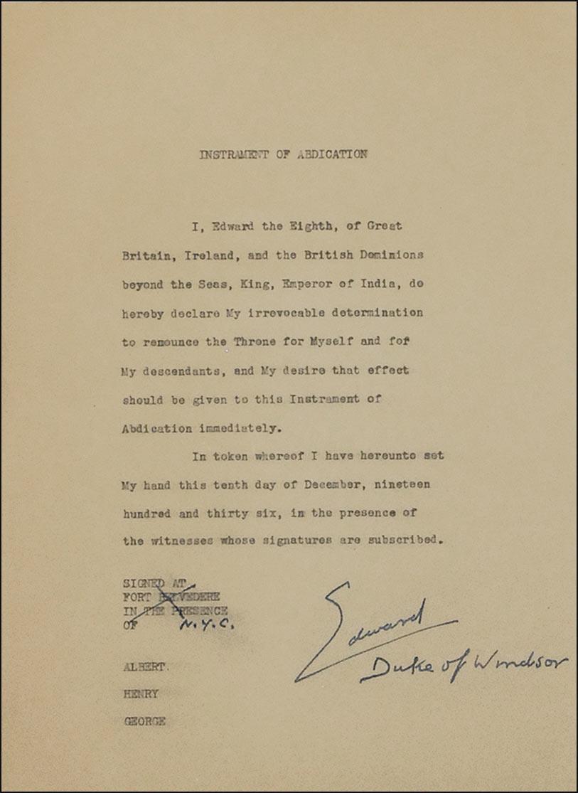 Souvenir typescript of the Instrument of Abdication, signed "Edward Duke of Windsor,” one page, 6.75 x 9, no date. In full, “I, Edward the Eighth, of Great Britain, Ireland, and the British Dominions beyond the Seas, King, Emperor of India, do hereby declare My irrevocable determination to renounce the Throne for Myself and for My descendants, and My desire that effect should be given to this Instrument of Abdication immediately. In token whereof I have hereunto set My hand this tenth day of December, nineteen hundred and thirty-six, in the presence of the witnesses whose signatures are subscribed.” It is noted in type that the actual Instrument of Abdication was “signed at Fort Belvedere in the presence of Albert, Henry, George,” his three brothers, with Edward crossing out that area of type and adding “N.Y.C.” Matted and framed to an overall size of 12 x 15. Light uniform overall toning, otherwise fine condition.