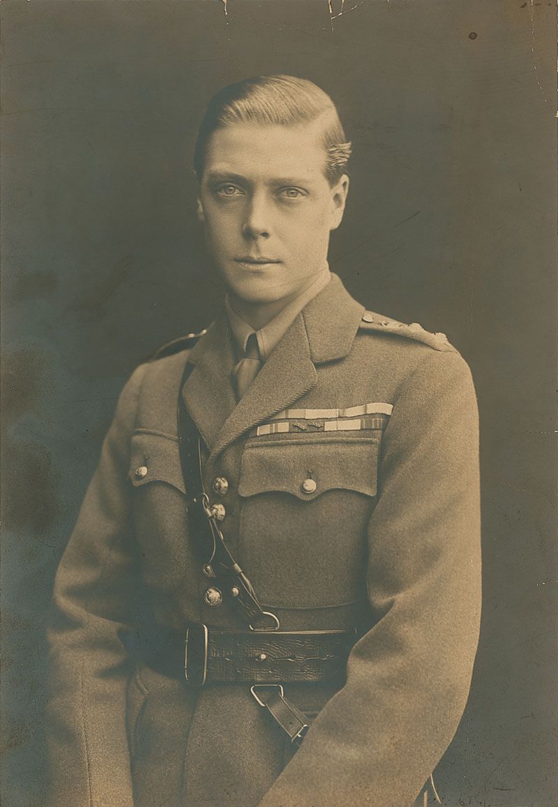 Original vintage crystal-clear 6.5 x 9.5 three-quarter length photo of Edward in his military uniform. A few small tears and creases to top edge, light silvering to dark background, a few fingerprints to left side, and mounting remnants to reverse, otherwise fine condition.