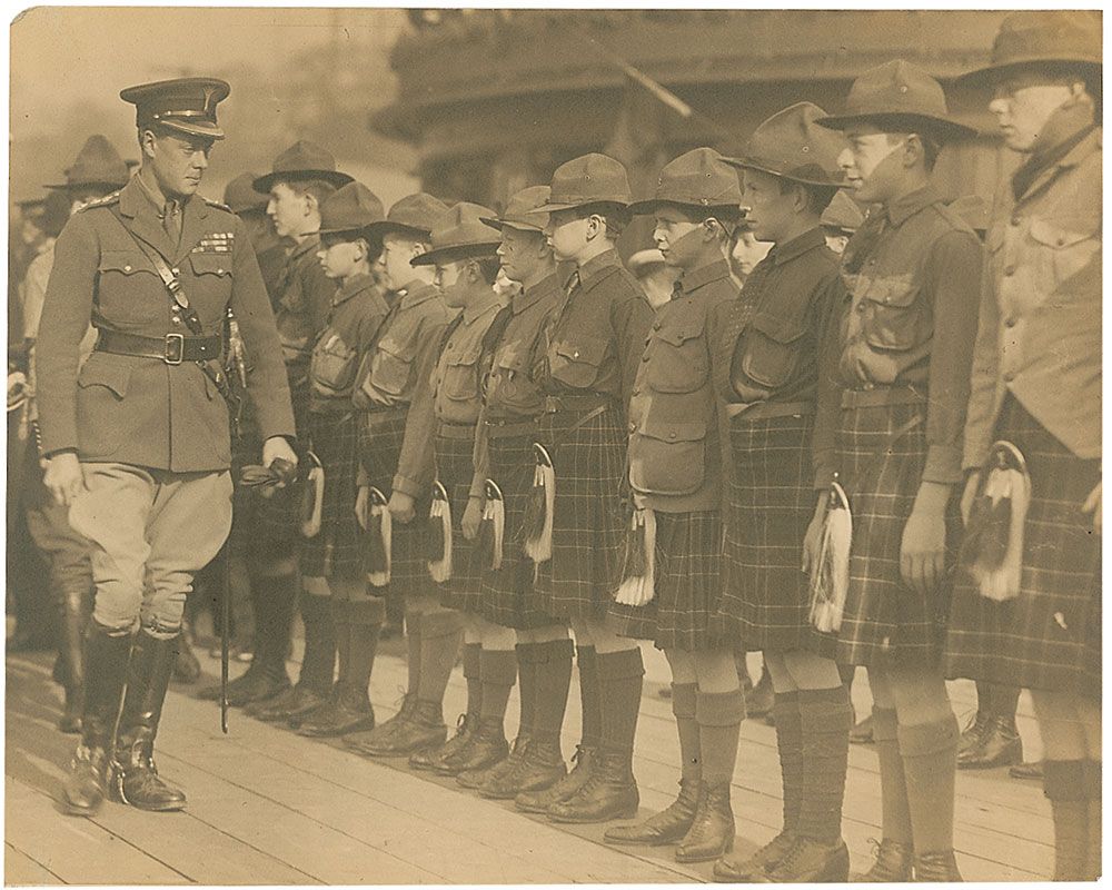 Original vintage 9.5 x 7.5 lightweight photo of Edward sternly inspecting a line of young scouts standing at attention. In fine condition, with a couple small corner tears and spots from mounting remnants on reverse and some mild edge curling.