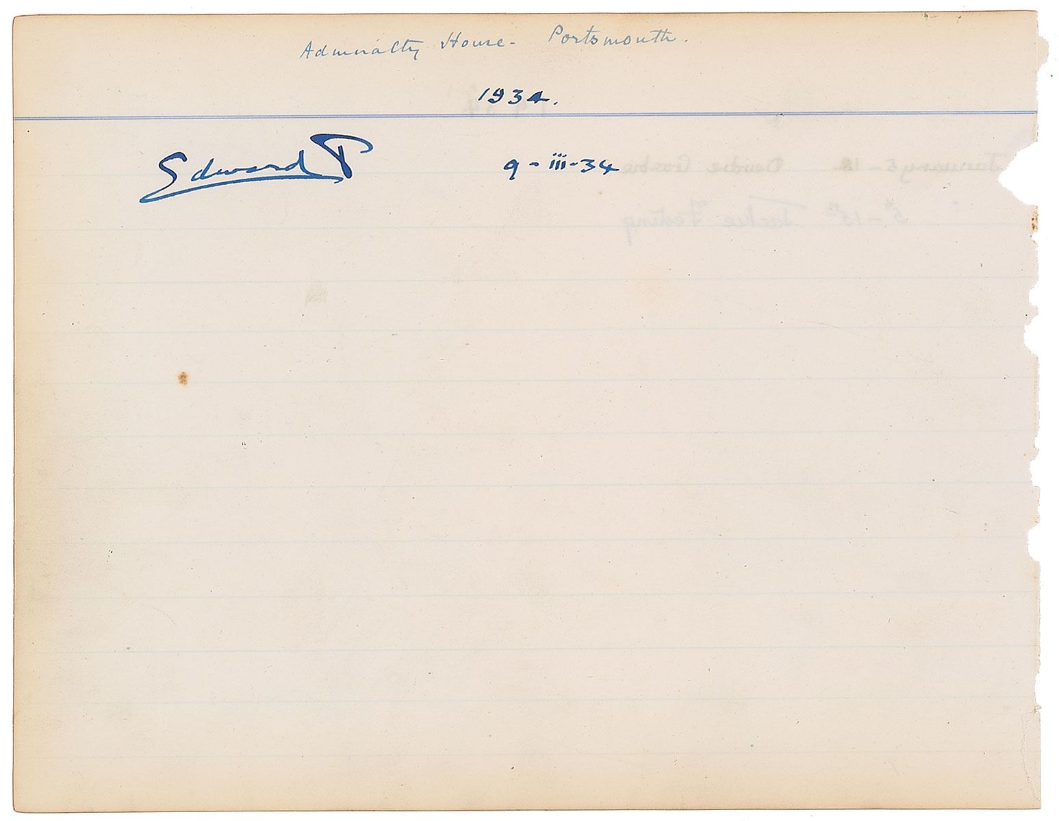 Blue fountain pen signature, "1934, Edward P. 9–iii–34,” on an off-white 10.75 x 8.25 guest book sheet, marked above in another hand, "Admiralty House—Portsmouth." In fine condition. A bold signature dating to the period Edward began to court the married Wallis Simpson.