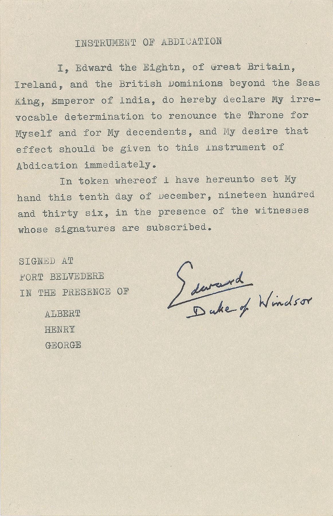 Souvenir typescript of King Edward VIII's "Instrument of Abdication," signed "Edward, Duke of Windsor," one page, 5.5 x 8.75, in part: "I, Edward the Eighth…do hereby declare My irrevocable determination to renounce the Throne for Myself and for My descendants, and My desire that effect should be given to this Instrument of Abdication immediately. In token whereof I have hereunto set My hand this tenth day of December, nineteen hundred and thirty-six." In fine condition, with trimmed edges. Edward's intention to marry the divorced American socialite Wallis Simpson caused a British constitutional crisis. Rather than give up his wife-to-be, he decided to abdicate. A historic piece from Edward VIII, who famously chose love over the British throne.