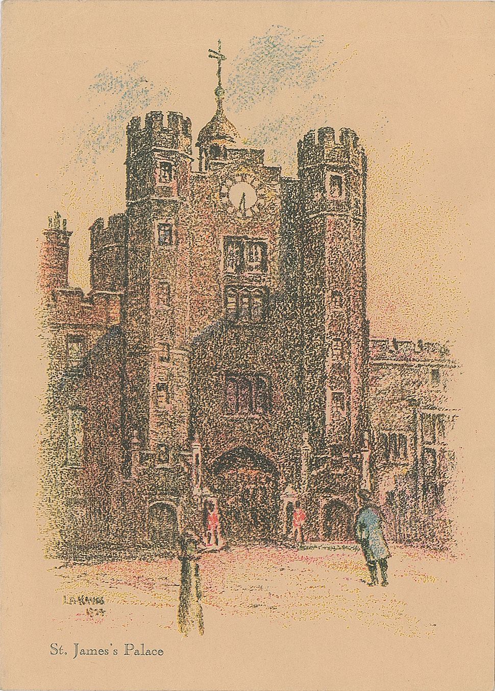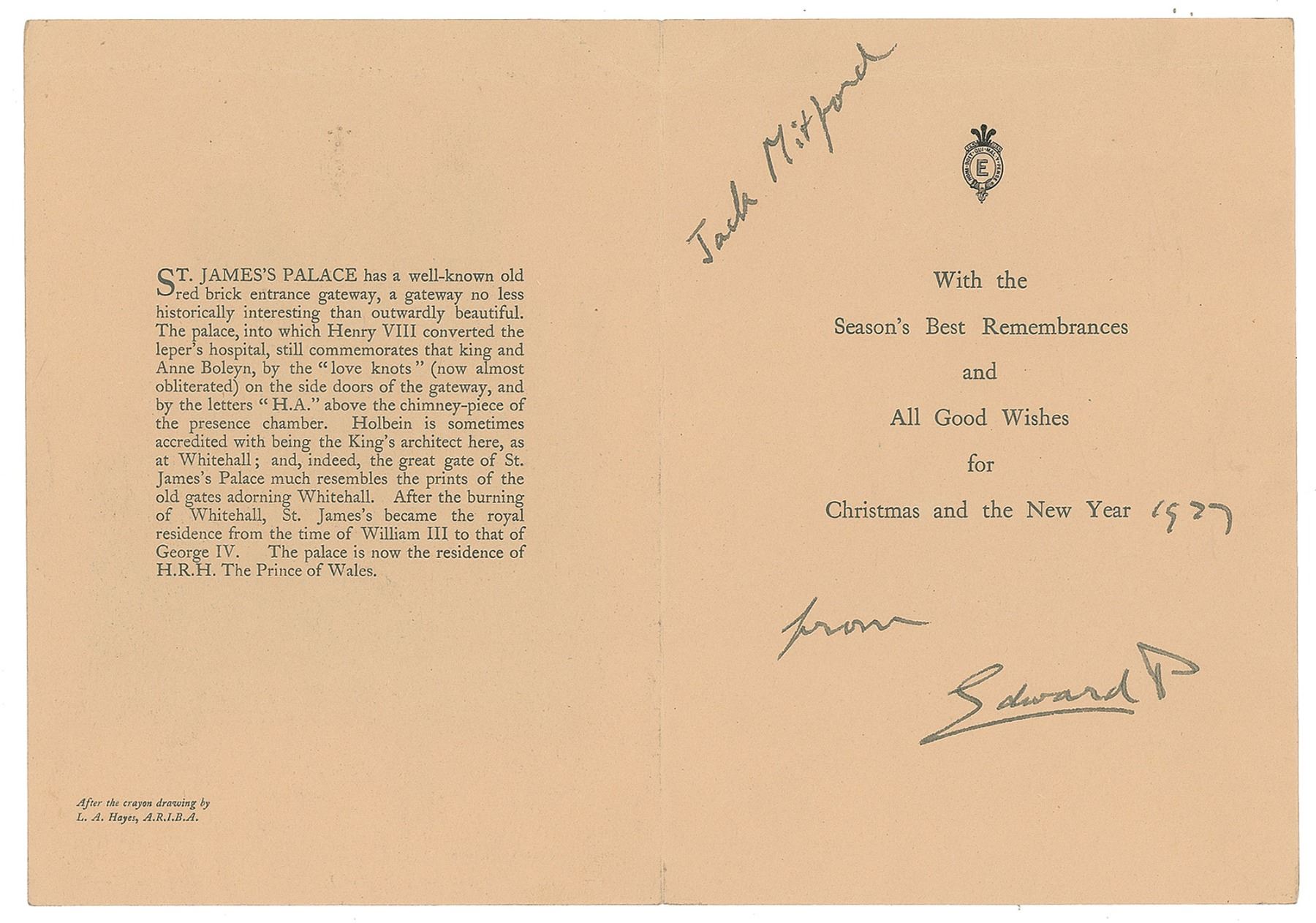 Christmas card from 1927, measuring 11.5 x 8 open, featuring an image of St. James's Palace on the front, signed and inscribed in ink, "Jack Mitford, from Edward P, 1927." In fine condition, with some light creasing to the top.