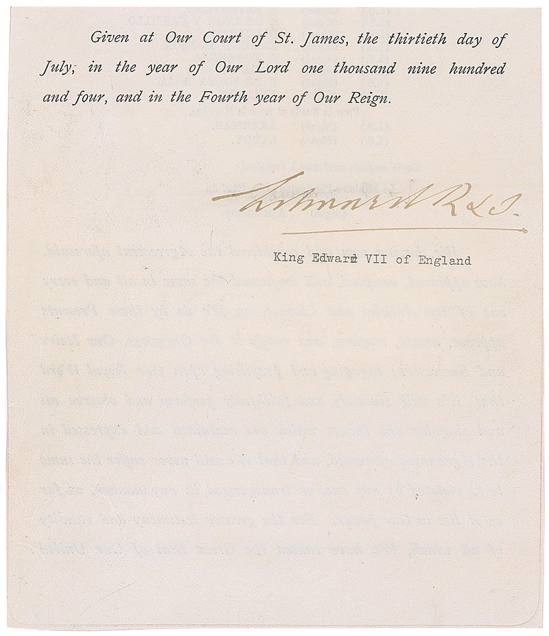Prince of Wales and first British monarch of the House of Saxe-Coburg and Gotha, Edward’s reign (1901–1910) was named the Edwardian era. Partial DS, signed “Edward R & I,” one page both sides, 6.25 x 7.25, July 30, 1904. Conclusion of a document regarding an international agreement. In fine condition, with lightly trimmed edges and a typed collector’s notation below the signature.