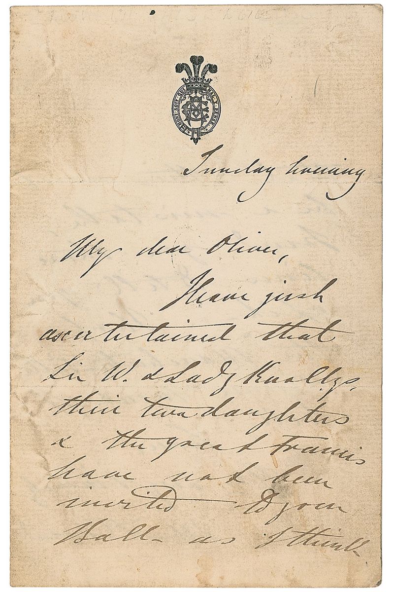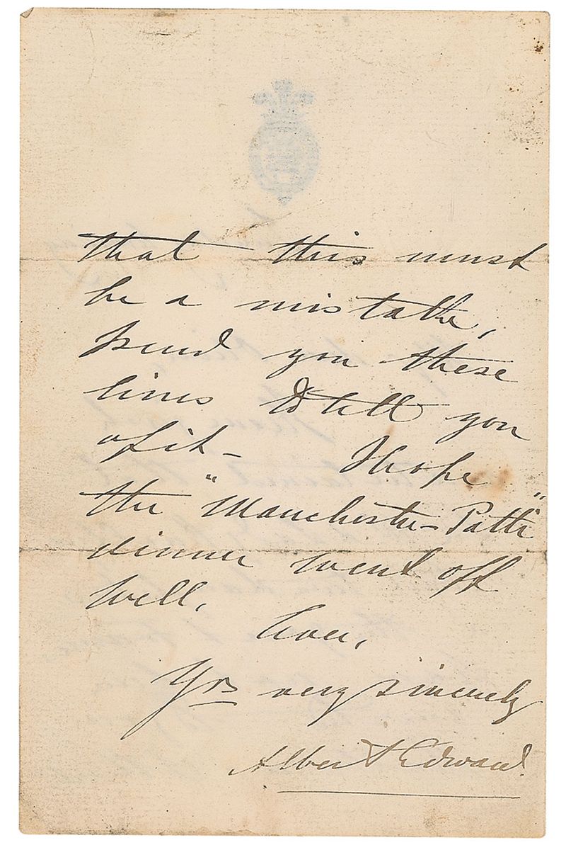 ALS signed “Albert Edward,” one page both sides, 3.75 x 6, personal letterhead, no date. Letter to “Oliver.” In part: “I have just ascertained that…their twin daughters & the great Francis have not been invited to your Ball…I think this must be a mistake.” Scattered soiling to the first page, otherwise fine condition.