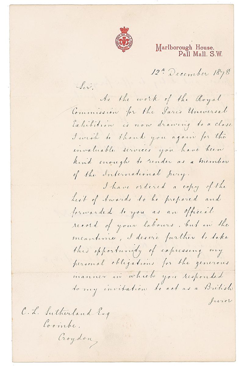 LS signed “Albert Edward,” one page both sides, 8 x 12.5, Marlborough House letterhead, December 12, 1878. Letter to C. L. Sutherland. In part: “As the work of the Royal Commission for the Paris Universal Exhibition is now drawing to a close I wish to thank you again for the invaluable services you have been kind enough to render as a member of the International Jury.” In fine condition, with some toning to reverse of second integral page.