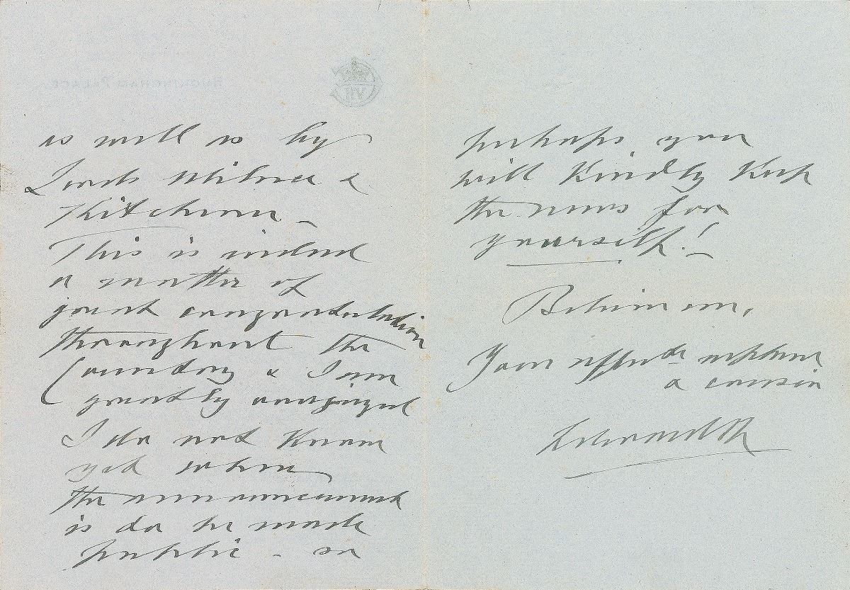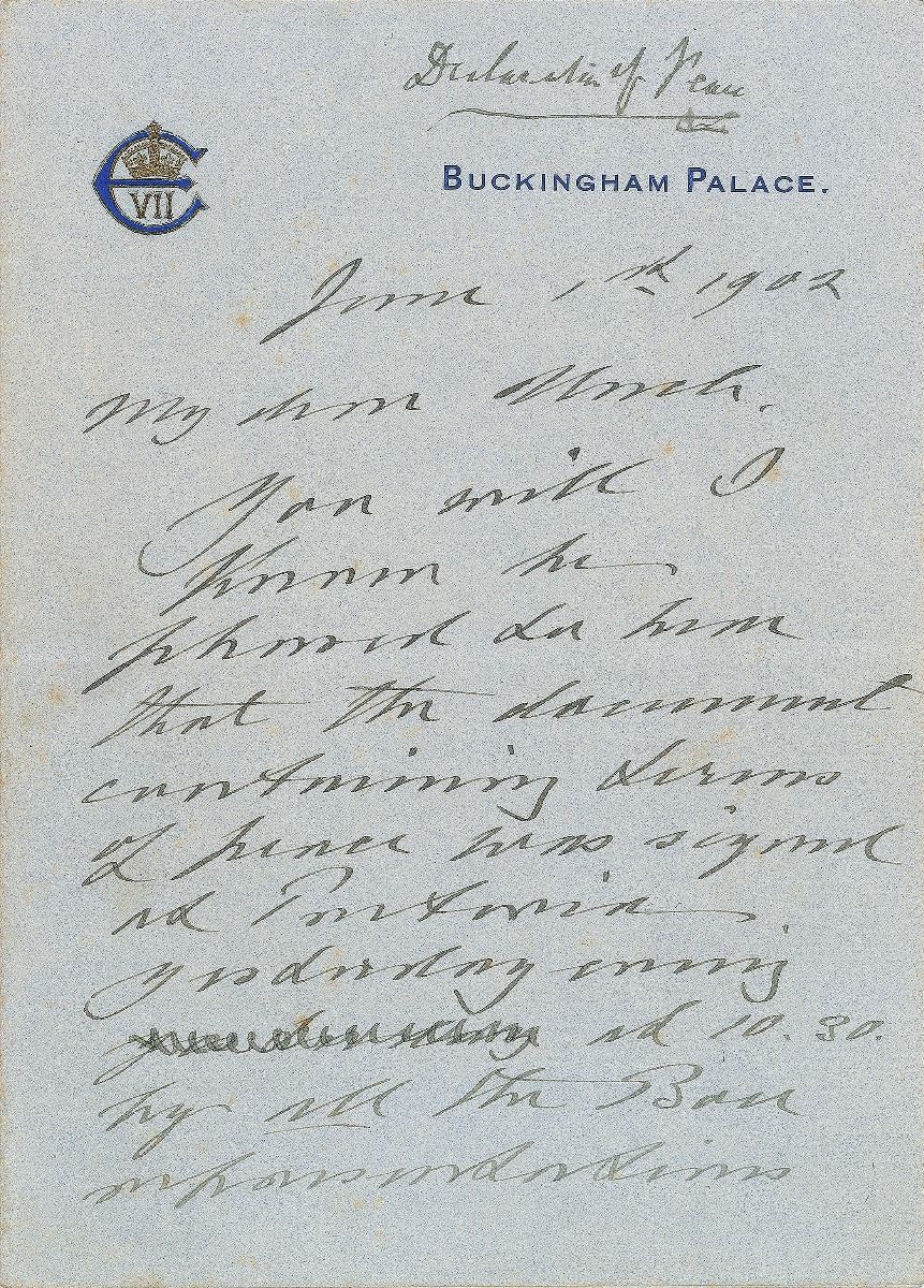 ALS signed “Edward R,” three pages on two adjoining sheets, 4.75 x 6.5, personal letterhead, June 1, 1902. Letter to his uncle George, Duke of Cambridge and former commander-in-chief of the army. In part: “You will I know be pleased to hear that the document containing terms of peace was signed at Pretoria yesterday morning at 10.30 by all the Boer representatives as well as by Lords Milner & Kitchener—This is indeed a month of great congratulation throughout the Country & I am greatly overjoyed. I do not know yet when the announcement is to be made public—so perhaps you will kindly keep the news for yourself!” In fine condition. The Treaty of Vereeniging had been signed the previous day, finally putting an end to hostilities after nearly three years. In this letter, the king informs his uncle of the good news before it became public. A rare and historically significant piece.