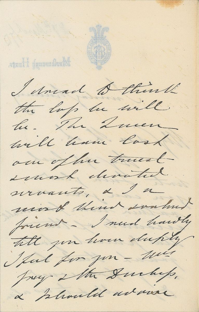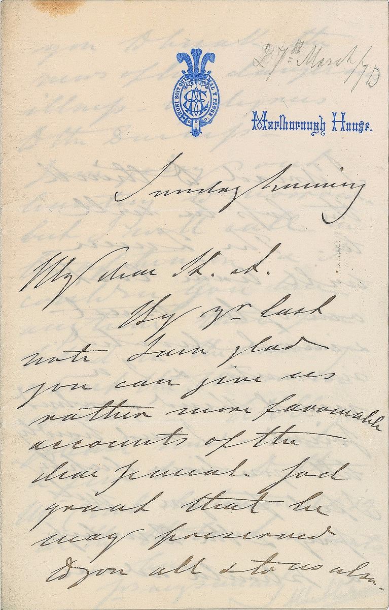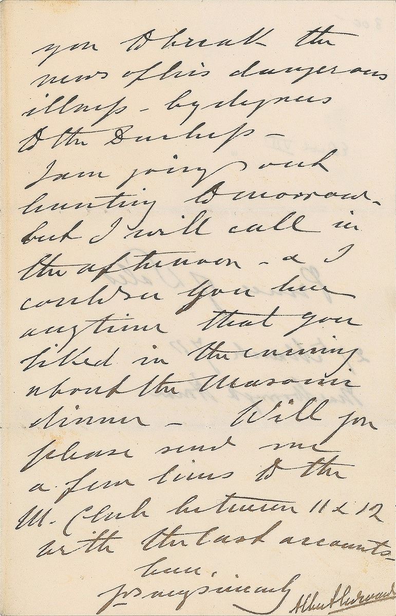 Prince of Wales and first British monarch of the House of Saxe-Coburg and Gotha, Edward’s reign (1901–1910) was named the Edwardian era. ALS signed “Albert Edward,” three pages on two adjoining sheets, 4.5 x 7, Marlborough House letterhead, March 27, 1872. In part: “By yr last note I am glad you can give us rather more favorable accounts of the dear General…I dread to think the loss he will be…I am going out hunting tomorrow but I will call in the afternoon.” In fine condition.