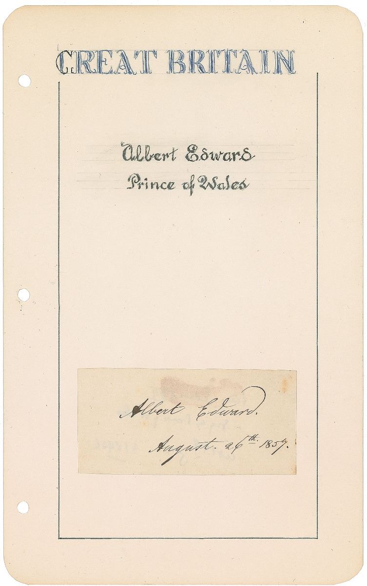 Prince of Wales and first British monarch of the House of Saxe-Coburg and Gotha, Edward’s reign, from 1901 to 1910, was named the Edwardian era (1841–1910). Super early ink signature, “Albert Edward, August 26th 1857,” on an off-white slip affixed to a 6 x 9.5 sheet hand-embellished with a calligraphic title. In fine condition, with light staining from old adhesive on the reverse. An appealing example from the prince at just fifteen years old.