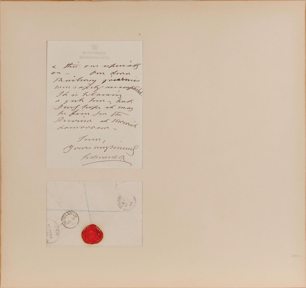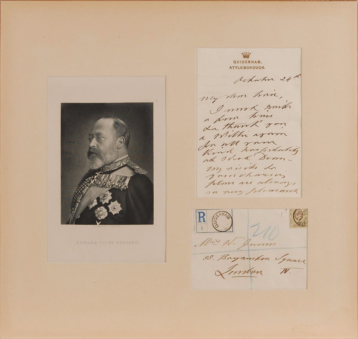 ALS signed “Edward R.,” one page both sides, 4.25 x 6, Quidenham, Attleborough letterhead, October 24, 1909. Brief letter of thanks for “kind hospitality.” Matted with an engraving and the original mailing envelope (addressed in his own hand), with windows on the reverse to view the signature to an overall size of 14.75 x 14. In fine condition.