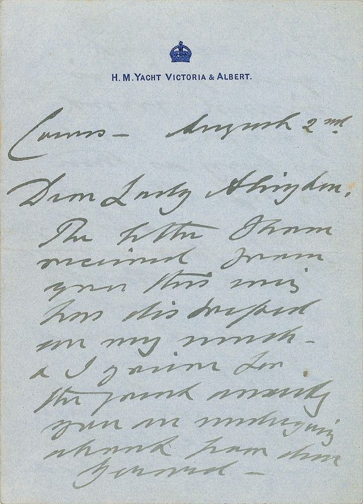 ALS, four pages on two adjoining sheets, 4.75 x 6.5, H. M. Yacht Victoria & Albert letterhead, August 2, no year. Letter to Lady Abingdon in which Edward relays his distress to her husband's illness, in part: "Nobody wishes him to get better more sincerely than I do. Tell him our visit to Ireland has been an unqualified success in every respect...we arrived this morning from Queen's Town after an excellent passage." In fine condition, with a bit of soiling to the last page.