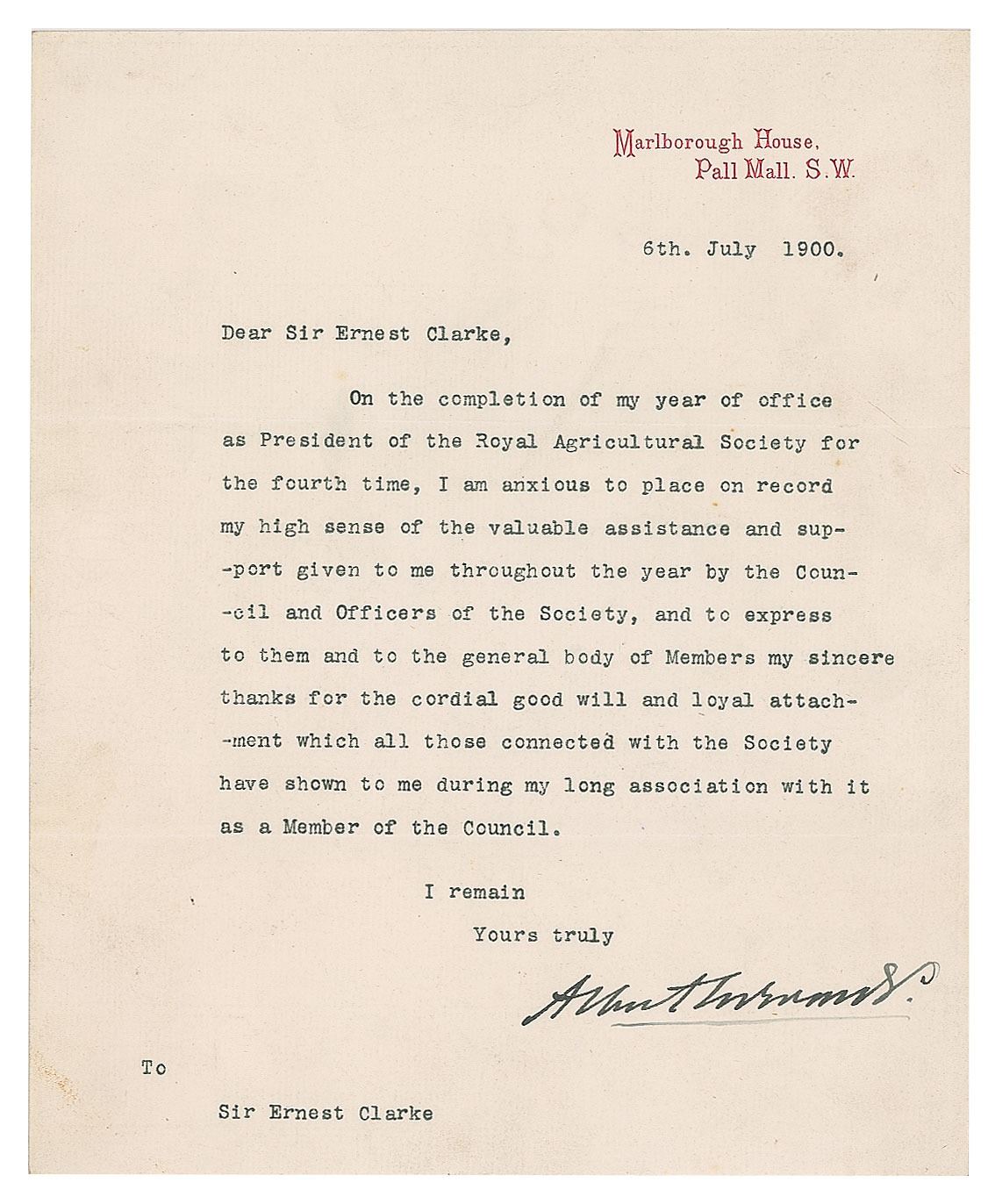 TLS signed “Albert Edward,” one page, 7.5 x 9, Marlborough House letterhead, July 6, 1900. Letter to Ernest Clarke, in full: "On the completion of my year of office as President of the Royal Agricultural Society for the fourth time, I am anxious to place on record my high sense of the valuable assistance and support given to me throughout the year by the Council and Officers of the Society, and to express to them and to the general body of Members my sincere thanks for the cordial good will and loyal attachment which all those connected with the Society have shown to me during my long association with it as a Member of the Council." In fine condition. In a half year's time Edward would assume the throne as King of the United Kingdom, Emperor of India and, in an innovation, King of the British Dominions. He chose to rule as Edward VII, instead of Albert Edward, asserting that he did not wish to 'undervalue the name of Albert' and minimize the status of his father with whom the 'name should stand alone.'
