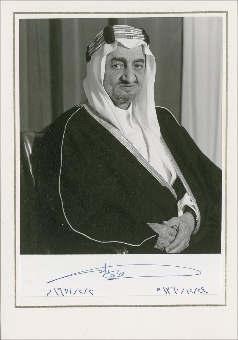 King of Saudi Arabia (born circa 1903) from 1964 until his death in 1975. Matte-finish 5.5 x 7.75 photo, signed in the lower border in blue ink. Photo is affixed in its original presentation folder. Some scattered mild staining from adhesive on reverse, otherwise fine condition.