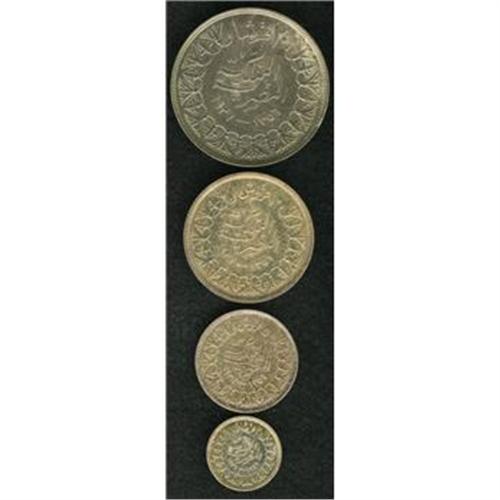 <B>King Farouk Royal Mint Silver Proof Set 1937, </B></I>KM365 2 Piastres, choice toned Proof, colorful patina, KM366 5 Piastres, choice Proof, attractively toned reverse, KM367 10 Piastres, choice Proof, lightly toned reverse, and KM368 20 Piastres, superb Proof, lightly toned, some faint hairlines in the obverse fields. It is believed that only ten sets were struck by the British Royal Mint as Proofs of record. A very rare and desirable set.