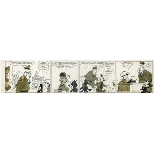 <B>King Features Artist - Felix the Cat Daily Comic Strip Original Art, dated 1-1-40 (King Features Syndicate, 1940).</B></I> The adventures of this popular feline star have been celebrated in recent years for the imaginative art of long-time <I>Felix</B></I> artist Otto Messmer. This particular example however, dating from New Year's Day, 1940, is clearly <I>not</B></I> by Messmer. In this strip, Felix plays sidekick to a kid character named Washy, who saves the day by rounding up a pair of dangerous thugs. The art has the look of classic strips of the era, but we have not been able to pin down exactly who this guest artist was. It's great stuff, though! The art measures 25.5" x 5.75" and has been cut between the second and third panels, then reattached using art tape on the back. The Zipatone film has yellowed and stained the board a bit, with one tiny piece having slipped off in panel three. A blue wash had been applied as a guide to placing the Zip, and there's a small area of water damage noticeable in the last panel, in the corner by Felix. Overall, the strip is in Very Good condition. A very unusual piece of <I>Felix</B></I> art!